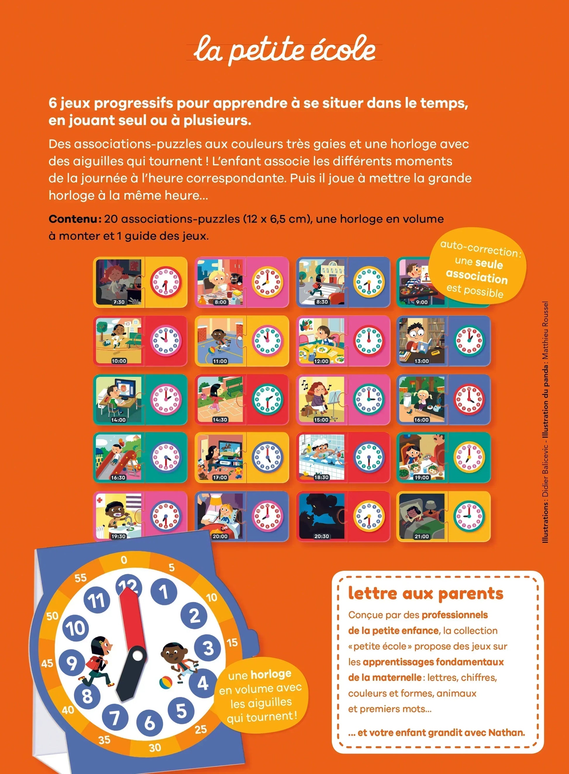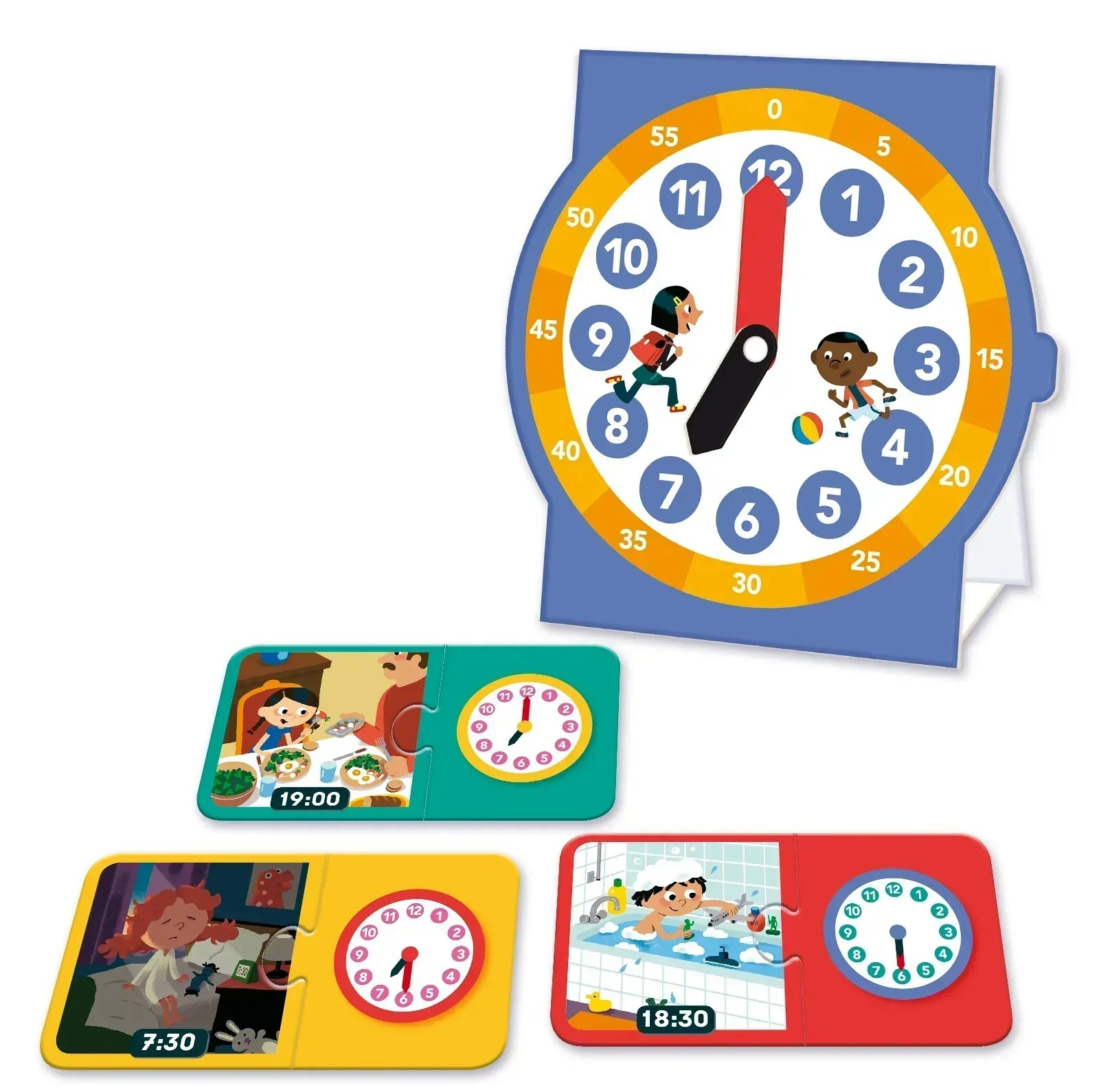 6 jeux progressifs pour apprendre à se situer dans le temps, en jouant seul ou à plusieurs. Des puzzles d'association aux couleurs très gaies et une horloge avec des aiguilles qui tournent. L'enfant associe les différents moments de la journée à l'heure correspondante. Puis, il s'amuse à mettre la grande horloge à la même heure.