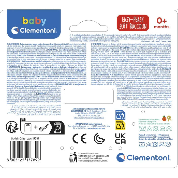 Un doux raton-laveur coloré proposant une multitude d’activités, facile à accrocher grâce à la pince et lavable.