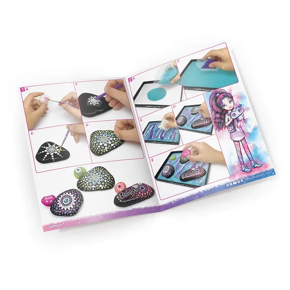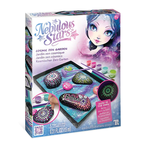 Voici 2 activités classiques rassemblées en un nouveau concept original : la peinture sur galets et le jardin zen japonais. Muni d'un grand plateau, de sable coloré et d'un mini râteau pour créer chaque jour des effets de galaxie différents. Décore 3 galets avec des transferts à frotter phosphorescents et de la peinture acrylique.