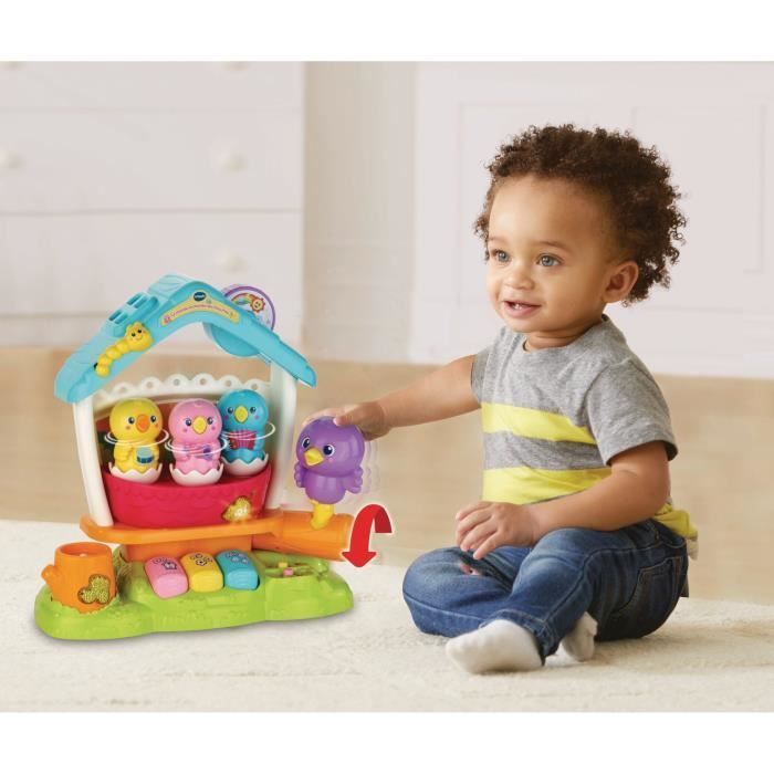 Une fois dans leur maison à oiseaux, les oisillons sautillent et font des pirouettes lorsque votre enfant joue du piano ou bouge la branche où se trouve la maman.